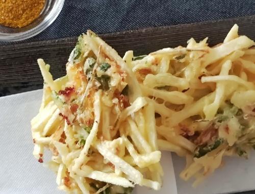 小さめのボウルに、片栗粉をまぶした具材1掴みと、溶いたてんぷら粉大さじ1強を入れ、ざっくりと混ぜ合わせる。1つずつ衣をまとわせることによって、生地が均等に付いてまとまりやすい。