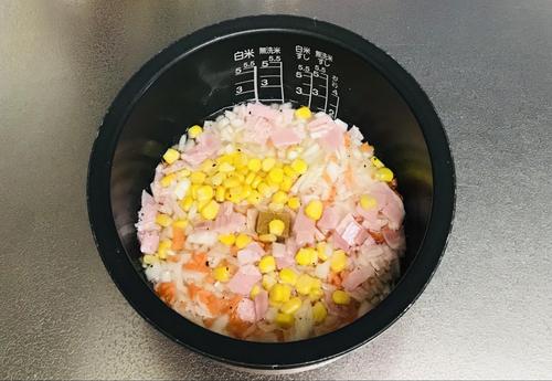炊飯器に、研いだ米、切った食材、酒を加える。2合の線まで水を注ぎ、コンソメキューブ、塩、黒コショウも加えて軽く混ぜる。