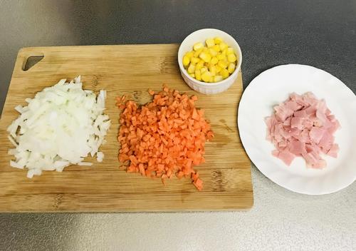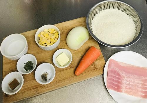 玉ねぎ、にんじんは端を落として皮をむき、みじん切りにする。ベーコンは1cm幅の角切りにする。冷凍コーンは解凍しておく。