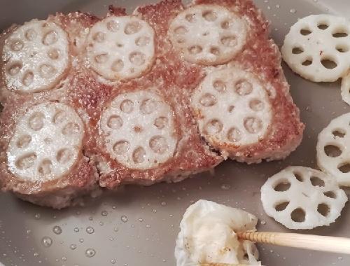 残ったレンコンはフライパンの空いたスペースに乗せ、中火にかける。肉の焼ける音がしてきたら、ふたをして2~3分焼く。崩れないように肉だねはいじらない。