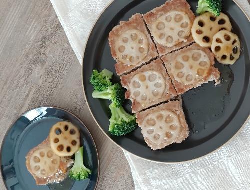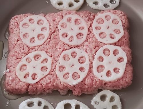 スライスしたレンコンに、片栗粉を両面にまぶす。レンコンはトレーのひき肉の上に押さえつけるように乗せる。