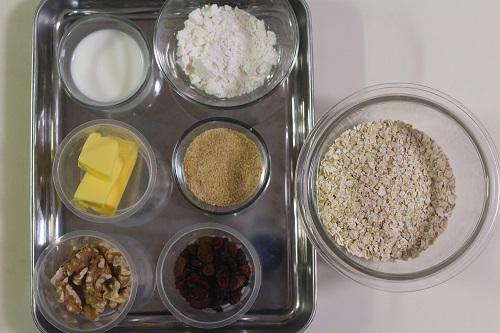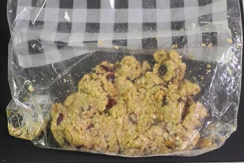 ビニール袋やジッパー付きの保存袋などにオートミール、薄力粉、砂糖、バター、牛乳、ドライフルーツミックス、クルミを入れる。よく揉み合わせて、ひとかたまりにする。