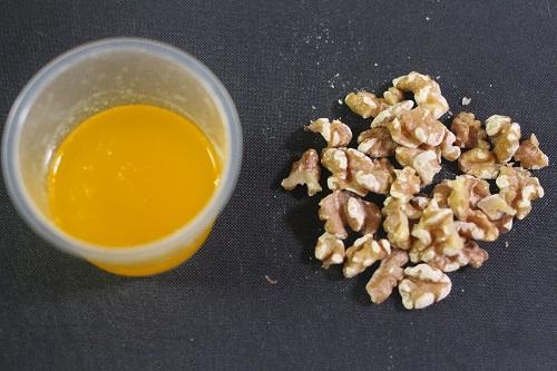 バターは500Wの電子レンジで20秒程度加熱して溶かす。クルミは粗く刻む。
