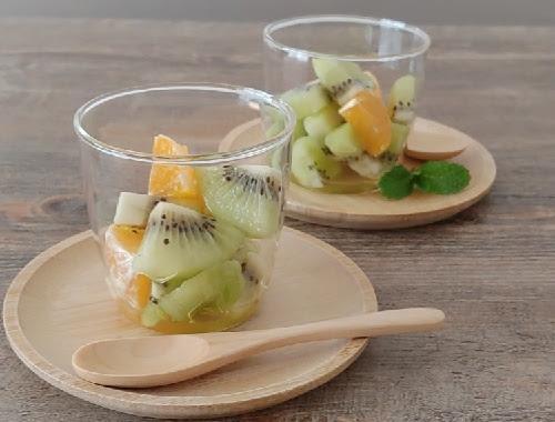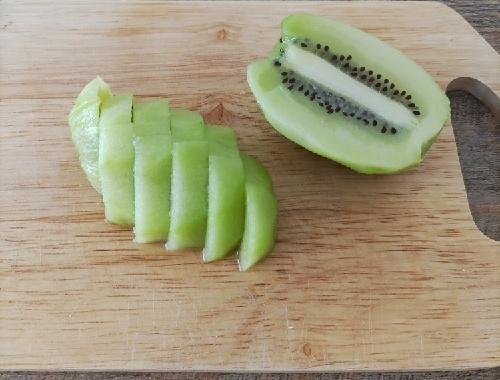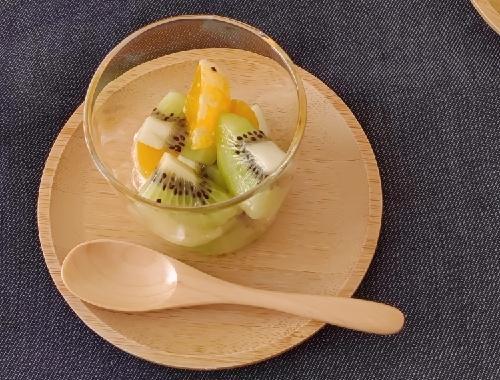 キウイは皮をむき、縦4等分にカットした後1cm幅にカットする。キウイが固い場合は、皮をむく前に軽く揉むと柔らかくなり、酸味が和らぐ。みかんも皮をむき、同様に縦4等分にカットした後1cm幅にカットする。