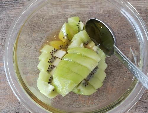 ボウルにカットしたキウイとはちみつを加え、軽く和える。キウイを潰さないよう、下の方からすくうように混ぜる。混ざったら冷蔵庫で15~30分寝かせる。