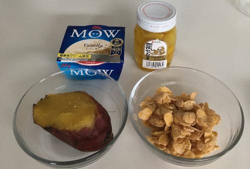 焼き芋は皮をむき、耐熱容器に入れる。粗みじんにした栗を入れ混ぜる。 500Wの電子レンジで30秒、ほんのりと温かくなるように加熱する。