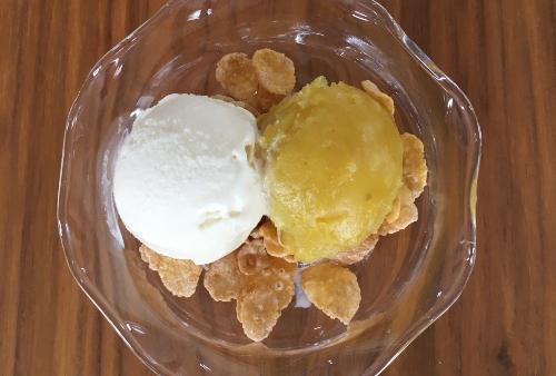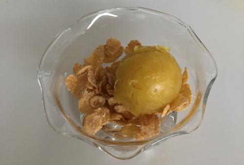 器の底にコーンフレークを敷き、アイスクリームディッシャーで栗きんとんとアイスクリームをすくい、器に盛りつければ完成だ。