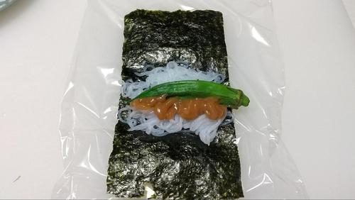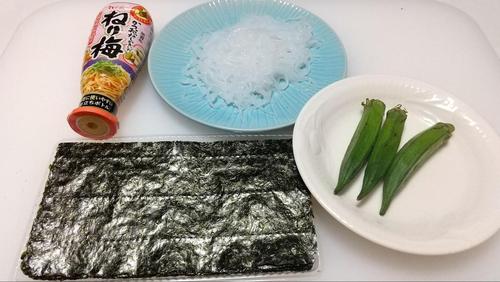 まな板にラップを敷いて海苔をおく。そこに、しらたき30g、オクラ1本、ねり梅10gを乗せてラップごと巻く。全部で3本作ろう。