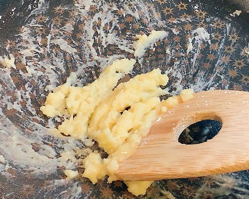 フライパンを熱し、バターを入れて中火で溶かす。一度火を止めて、小麦粉を入れて混ぜ合わせる。