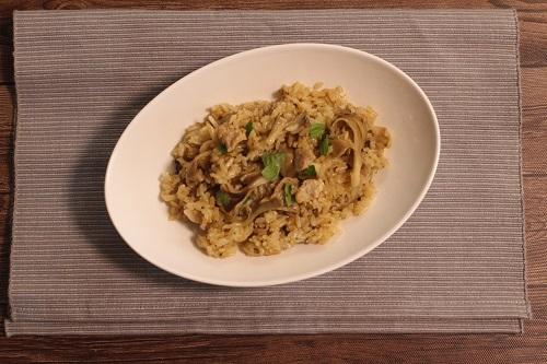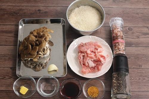 炊飯釜に米、酒、醤油、顆粒コンソメを入れ、水を2合の目盛りまで入れて全体を混ぜる。その上に、舞茸、にんにく、豚肉をのせて炊飯器で炊く。