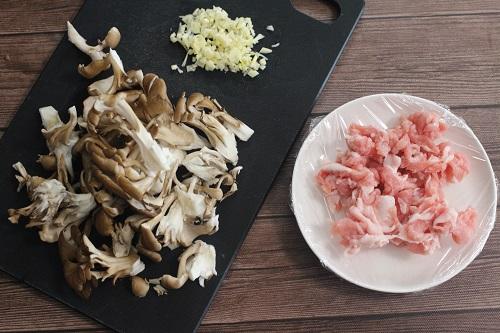 米は洗って30分以上浸水させる。舞茸は石づきを取り除き、小房に分け、にんにくはみじん切りにする。豚肉は2~3cm幅に切る。