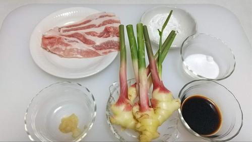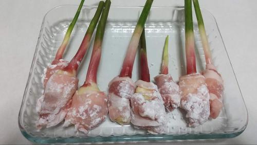 谷中生姜は汚いところを切り落とし、長すぎる茎を切り揃える。豚肉をそれぞれに巻きつけて片栗粉をまぶす。豚肉がすっぽりと抜けてしまうこともあるので、しっかりと巻く。
