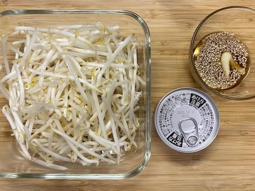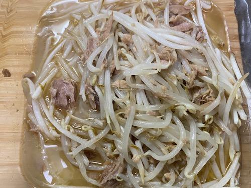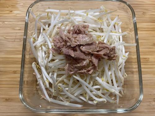 もやしは洗って、ツナは軽く油をきって耐熱容器に入れる。