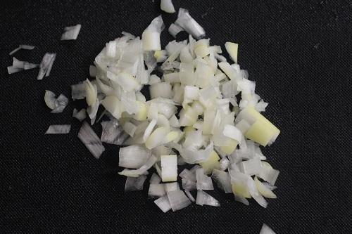 長ねぎをみじん切りにする。ここでは、長ねぎのみじん切りを簡単にする方法をご紹介しよう。まず、端から斜めに2~4cm幅の切り込みを入れていく。この時、厚みの半分くらいまで切り込みを入れ、切り落とさないように注意する。次に、ひっくり返して反対側も同じように切り込みを入れていく。最後に端から2~3mm幅で切っていくとみじん切りの完成だ。