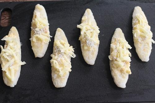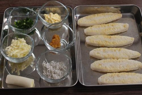 笹かまぼこに味噌マヨネーズソースを塗り、しらす、シュレッドチーズをのせる。オーブントースターで表面に焼き色が付くまで5分程度焼く。