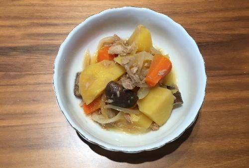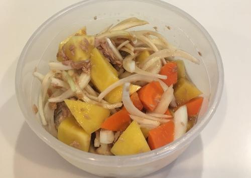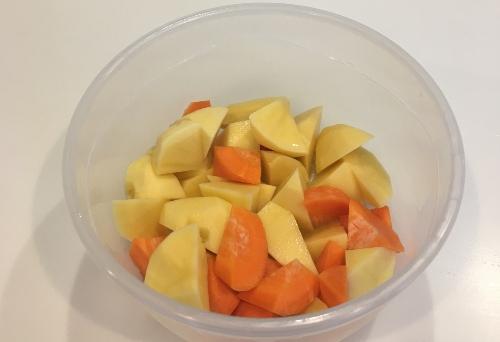 じゃがいもとにんじんの皮をむき、食べやすい大きさに乱切りにする。切ったじゃがいもとにんじんを耐熱容器に入れ、ラップをかけて500Wの電子レンジで2分加熱する。