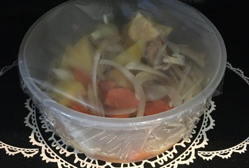 500Wの電子レンジで3分加熱する。上下を返すように混ぜ、もう一度ラップをしてさらに3分加熱する。加熱が終わったら、粗熱がとれるまでラップをしたまま冷ます。こうすることで余熱で具材にしっかりと味がしみ込む。