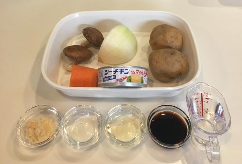 先ほどの耐熱容器に、切った玉ねぎとしいたけ、ツナ缶を油ごと加え混ぜる。しょうゆ、酒、みりん、砂糖、水も加え、全体に調味料がなじむように混ぜ、ラップをふんわりとかける。