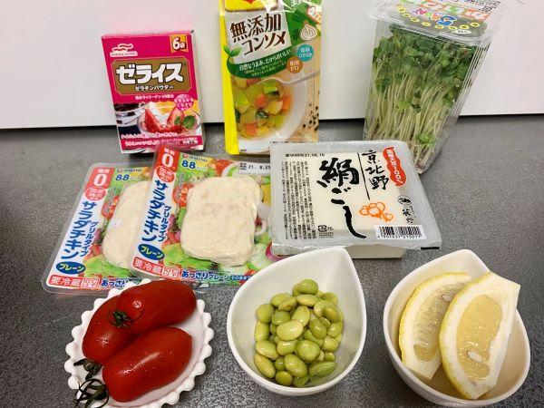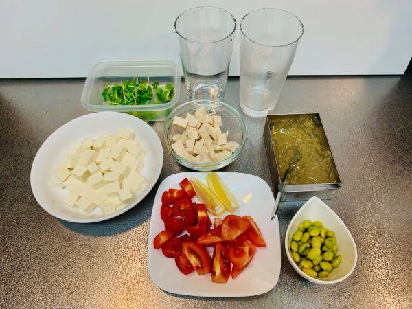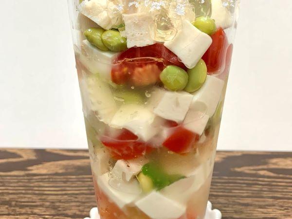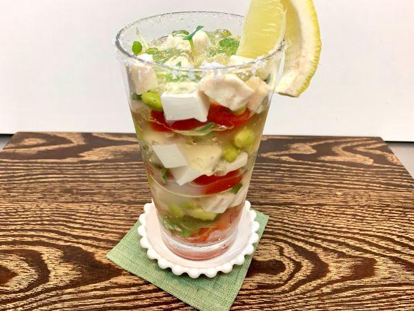 背の高いグラスを用意する。一番下にはミニトマトや枝豆、かいわれ大根などの野菜、次に豆腐とチキン、ジュレの順に材料を次々と重ねて入れる。赤いトマト、緑の野菜、豆腐やチキンの白色など、相互のコントラストがはっきりするように工夫して入れる。なお、かいわれ大根は最後の飾りとしても使うので、少し残しておこう。