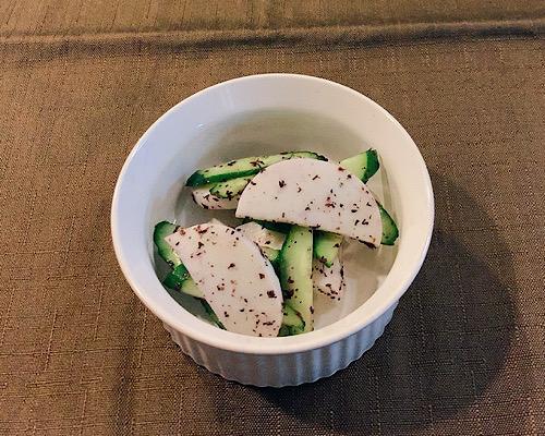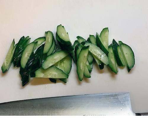キュウは端を落として薄く斜め切りにし、さらにそれを半分にカットしておく。細切りにしてもよいけれど、かまぼこの大きさとの兼ね合いを考えると、半分にカットする程度が丁度よいだろう。