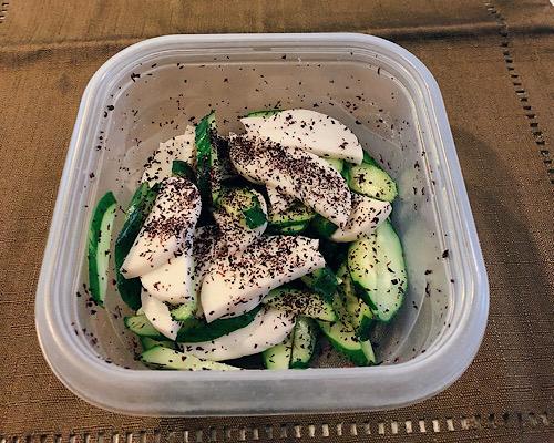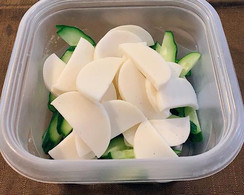 かまぼこと板の隙間に包丁を差し込み、丁寧にかまぼこを剥がす。輪切りのように、片端から薄切りにしていく。キュウリとかまぼこをタッパーなどに入れて合わせる。