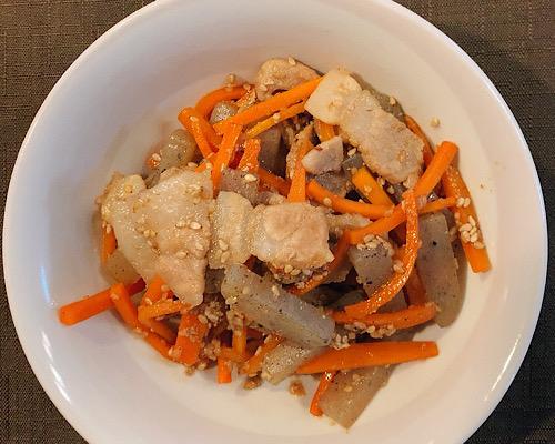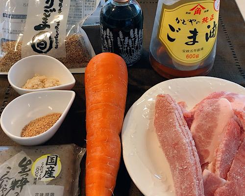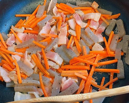 フライパンにごま油をひいて、豚肉、こんにゃく、にんじんを中火で3?4分程度炒める。
