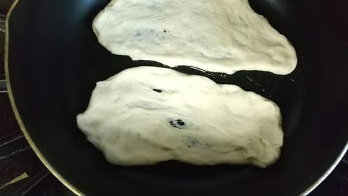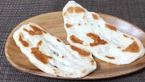 発酵した生地を、ふたたび2分くらい捏ねる。台に叩きつけたり、伸ばしたりしてみよう。捏ねおわったら、2等分にする。ナンの形に伸ばして、熱したフライパンに入れ、片面2?3分ずつ焼く。