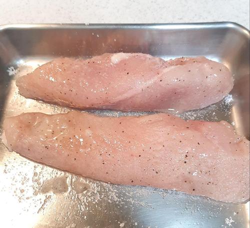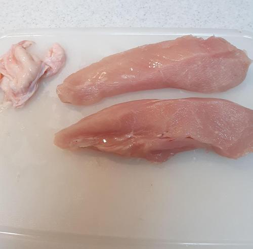 鶏むね肉の皮を外し、血管をカットしてから鶏むね肉を半分にカットする。