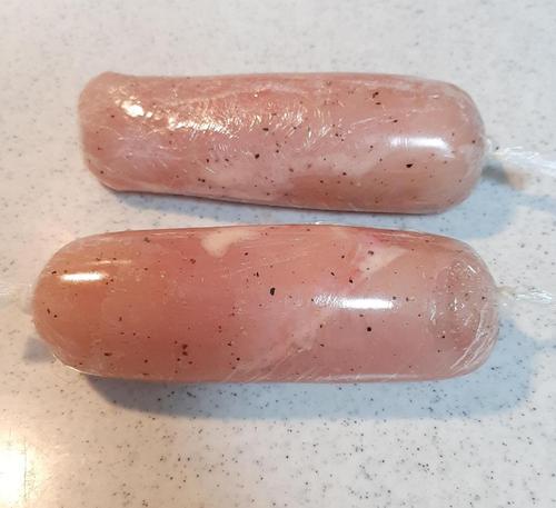 ラップで鶏むね肉をしっかりと包み、両端を固結びにする。