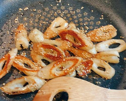 フライパンにごま油をひいて、中火でちくわを炒めていく。途中で、和風かつお出汁の素を加えて絡めていく。