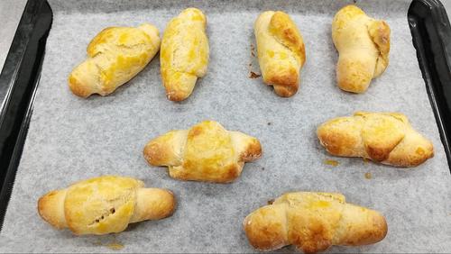 オーブンを210℃の15分に予熱する。巻いた生地をオーブンシートを敷いた天板に並べて、先ほど残しておいた卵黄を塗る。上から濡らしたクッキングペーパーか濡れ布巾をかけて、さらにラップをする。予熱が終わるまでの時間を使って2次発酵させる。