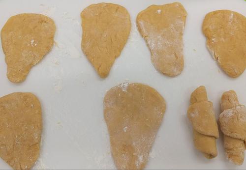 生地が1次発酵して2倍程度に膨らんだら、少しガス抜きをする程度に捏ねる。1分位捏ねたら8等分に分ける。分けたものを2等辺三角形のような形に伸ばす。伸ばしたら、三角形の底辺からクルクルと巻いていく。巻けたら、濡らしたクッキングペーパーをかけておく。