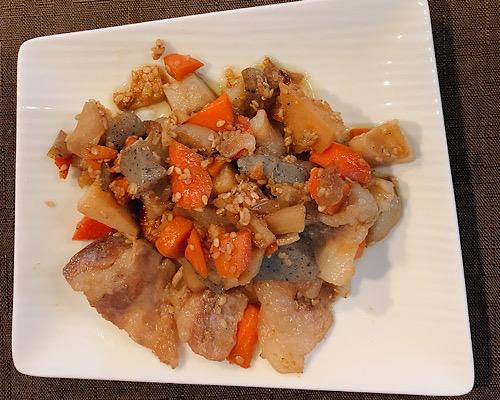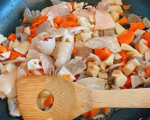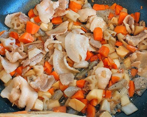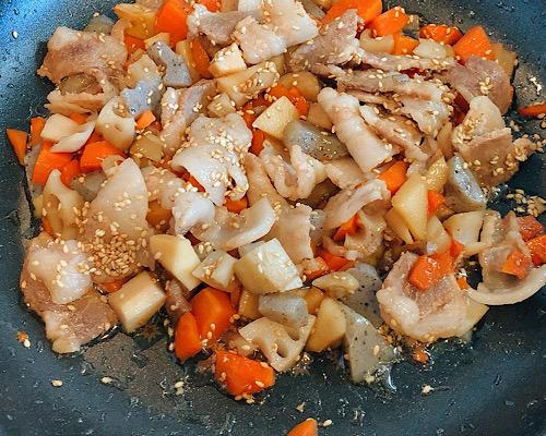 フライパンにごま油をひいて、豚肉とカットした野菜類を中火で炒めていく。