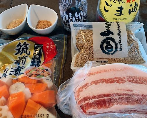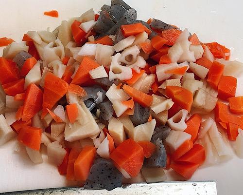 筑前煮の具材を袋から取り出して、全体的に半分ぐらいの大きさになるように、適当にカットしておく。豚肉はキッチンバサミを活用して、3等分に切っておく。