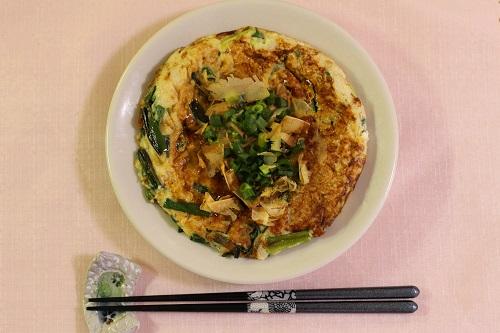 焼けたらフライパンから取り出し、器に盛り付ける。お好みでソース、鰹節などをトッピングして完成。