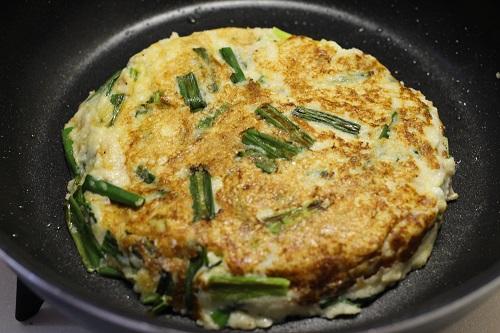 フライパンにごま油を入れて中火で熱し、STEP2で作った生地を流し込入れる。火を弱め、蓋をして片面2~3分ずつ焼く。途中でごま油を足しながら、表面がカリカリになるように焼くと美味しく仕上がる。