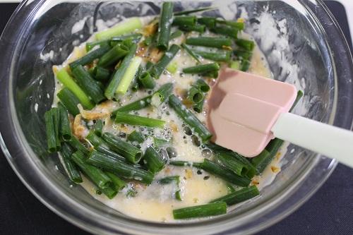 ボウルに卵、長芋、白だし、片栗粉の順に入れて、泡立て器でよく混ぜ合わせる。混ざったら青ネギ、桜えびを加えて全体をサックリと混ぜる。