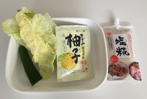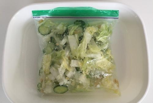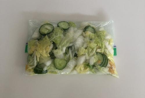 保存袋に白菜、きゅうり、乾燥柚子、塩麹を入れ、空気を含ませて口を閉める。塩麹が全体に混ざるように上下にふる。