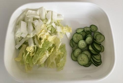 白菜は1cm幅に切る。きゅうりは輪切りの薄切りにする。