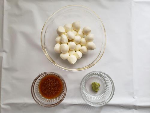 モッツァレラチーズは、水気をしっかり切る。モッツァレラチーズをボウルに入れて、醤油麹、わさびを加える。