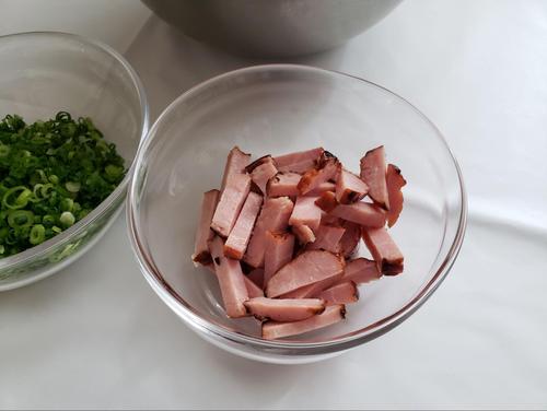 焼豚は一口大の拍子木切りにする。この切り方にすると巻く時に巻きやすく、食べた時も食べ応えがある。小ネギはみじん切りにしておく。