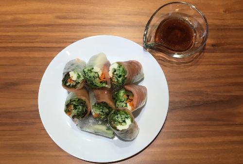 4枚とも巻き終わったら真ん中で半分に切り、皿に盛りつければ完成だ。ドレッシングは、好みに合わせて食べるときにかけるとよいだろう。
