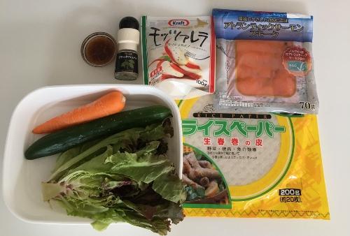 ボウルにぬるま湯をはり、生春巻きの皮をさっと水に浸け、硬さが残る程度で取り出す。キッチンペーパーで生春巻きの皮の余分な水分を拭き取り、乾いたまな板に広げる。皮の手前にサニーレタス、きゅうり、にんじん、モッツァレラチーズをのせ、中心あたりにスモークサーモンをのせて黒こしょうをふる。
