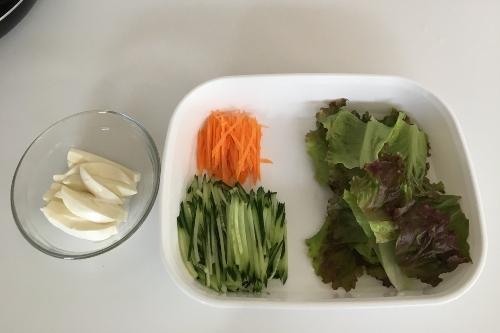 サニーレタスは流水で洗い、キッチンペーパーで水気を拭き取り食べやすい大きさにちぎる。きゅうりは斜め薄切りにし、千切りにする。にんじんも皮をむき千切りにする。モッツァレラチーズは7mm幅の棒状に切る。