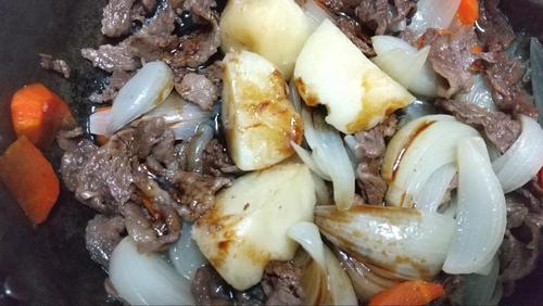 Step.2 炒めてから醤油以外の調味料を入れて煮込む