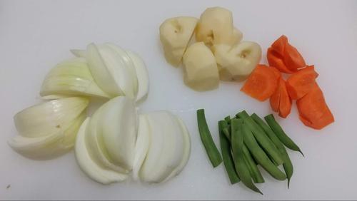 じゃがいもは皮をむいて4等分にする。人参は皮と端を除き、ひと口大に切る。玉ねぎは皮と端を除いて8等分、いんげん豆は3等分に切る。