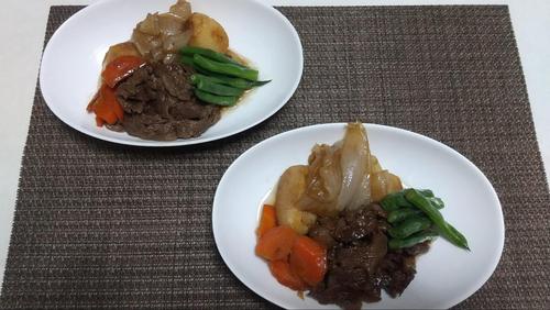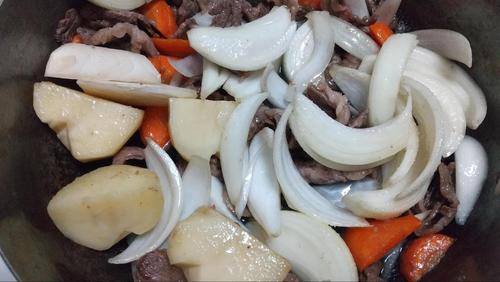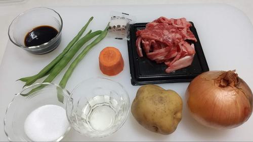 鍋に牛脂とサラダ油を入れて肉を炒める。少し色が変わってきたら、じゃがいもと人参を入れて炒める。じゃがいもや人参の周りが透明になってきて馴染んできたら玉ねぎを入れる。サッと混ぜ合わせる程度炒めたら、酒と砂糖を加える。きちんと蓋をして中火で15分煮込む。蓋がきちんと閉まる鍋を使うのがポイントだ。その間に、いんげん豆の筋を取り茹でておく。