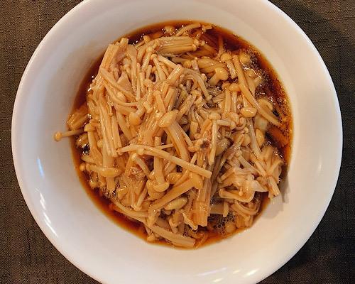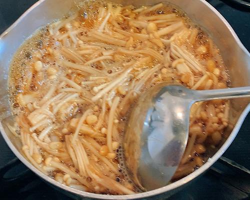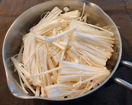 えのきの根元を切り落としてから、半分にカットする。まとまっているところは手でほぐしながら、鍋に入れていく。