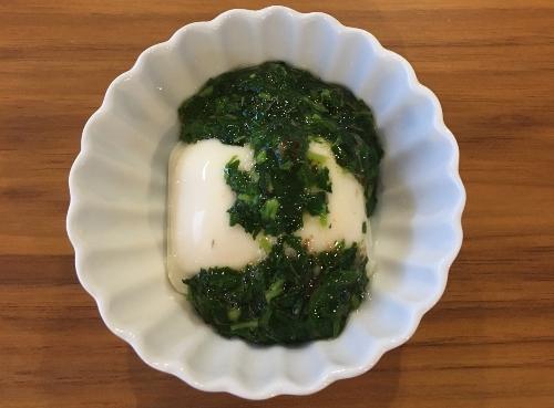 調味液が冷めたら、モロヘイヤ、かつお節を入れよく混ぜる。豆腐を皿に盛り、モロヘイヤソースを乗せれば完成だ。
