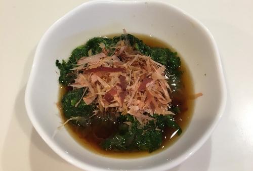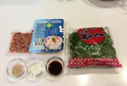 モロヘイヤを茎と葉に分け、今回は葉の部分を使う。鍋に湯を沸かし、沸騰したらモロヘイヤが柔らかくなるまで1分程茹でる。茹であがったらすぐに冷水で冷まし、軽く水気をしぼる。調味液を作る。耐熱容器に、水、しょうゆ、みりん、顆粒和風出汁を入れ、500Wの電子レンジで1分加熱して冷ましておく。